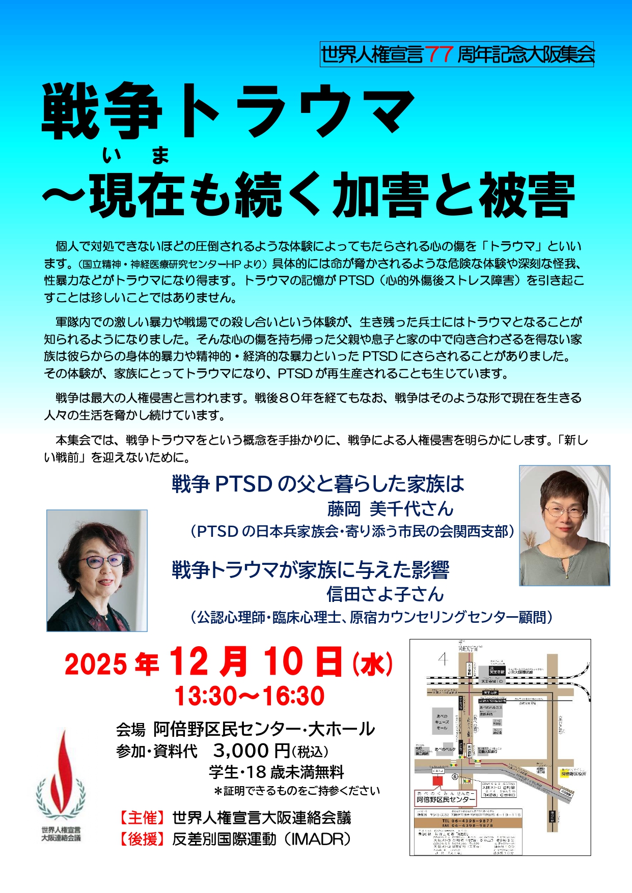 軍隊での経験が、生き残った兵士のトラウマとなることが知られるようになりました。そして彼らと向き合う家族たちが、彼らから身体的/精神的/経済的な暴力といったPTSDにさらされたこと、その体験が家族にとって新たなトラウマになりPTSDが再生産されることも生じています。戦後80年を経てもなお、戦争はそのような形で現在を生きる人々の生活を脅かしています。 本集会では、戦争トラウマをという概念を手掛かりに、戦争による人権侵害を明らかにします。「新しい戦前」を迎えないために。 【プログラム】 講演「戦争PTSD の父と暮らした家族とは」(30分) 藤岡美千代さん(PTSDの日本兵家族会・寄り添う市民の会関西支部) 講演「戦争トラウマが家族に与えた影響」(60分) 信田さよ子さん(公認心理師・臨床心理士、原宿カウンセリングセンター顧問) おふたりとの対話(60分) 進行:森実・世界人権宣言大阪連絡会議代表幹事 【参加申込方法】 入場には参加券が必要です。申込された方には参加券をお渡しします。 ●世界人権宣言大阪連絡会議 加盟団体・地域連絡会議にご所属の方 ご所属の団体・担当者へお申し込みください。 ●上記以外の方 下記いずれかの方法でお申し込みください。 ①申込フォームに必要事項を記入の上、送信ください。 https://ws.formzu.net/dist/S52567160/ ②世界人権宣言大阪連絡会議へfaxまたはEmailにて、⑴お名前、⑵参加者数、 ⑶電話番号、⑷メールアドレス、⑸ご住所をお知らせください。 |
