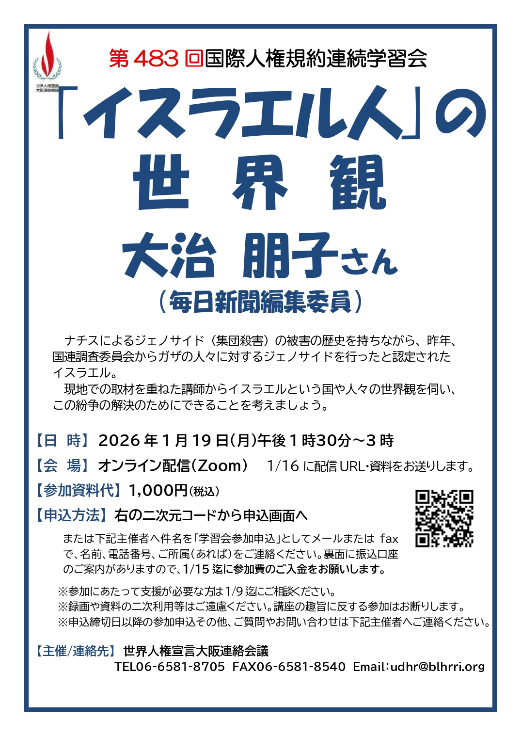 ナチスによるジェノサイド(集団殺害)の被害の歴史を持ちながら、昨年、国連調査委員会からガザの人々に対するジェノサイドを行ったと認定されたイスラエル。 現地での取材を重ねた講師からイスラエルという国や人々の世界観を伺い、この紛争の解決のためにできることを考えましょう。 【申込フォーム】https://ws.formzu.net/dist/S77615958/ ※フォームを使った申し込みは1/15まで。 申込みフォームをご利用できない方や直前のお申込みはメール・faxで受付します。 |